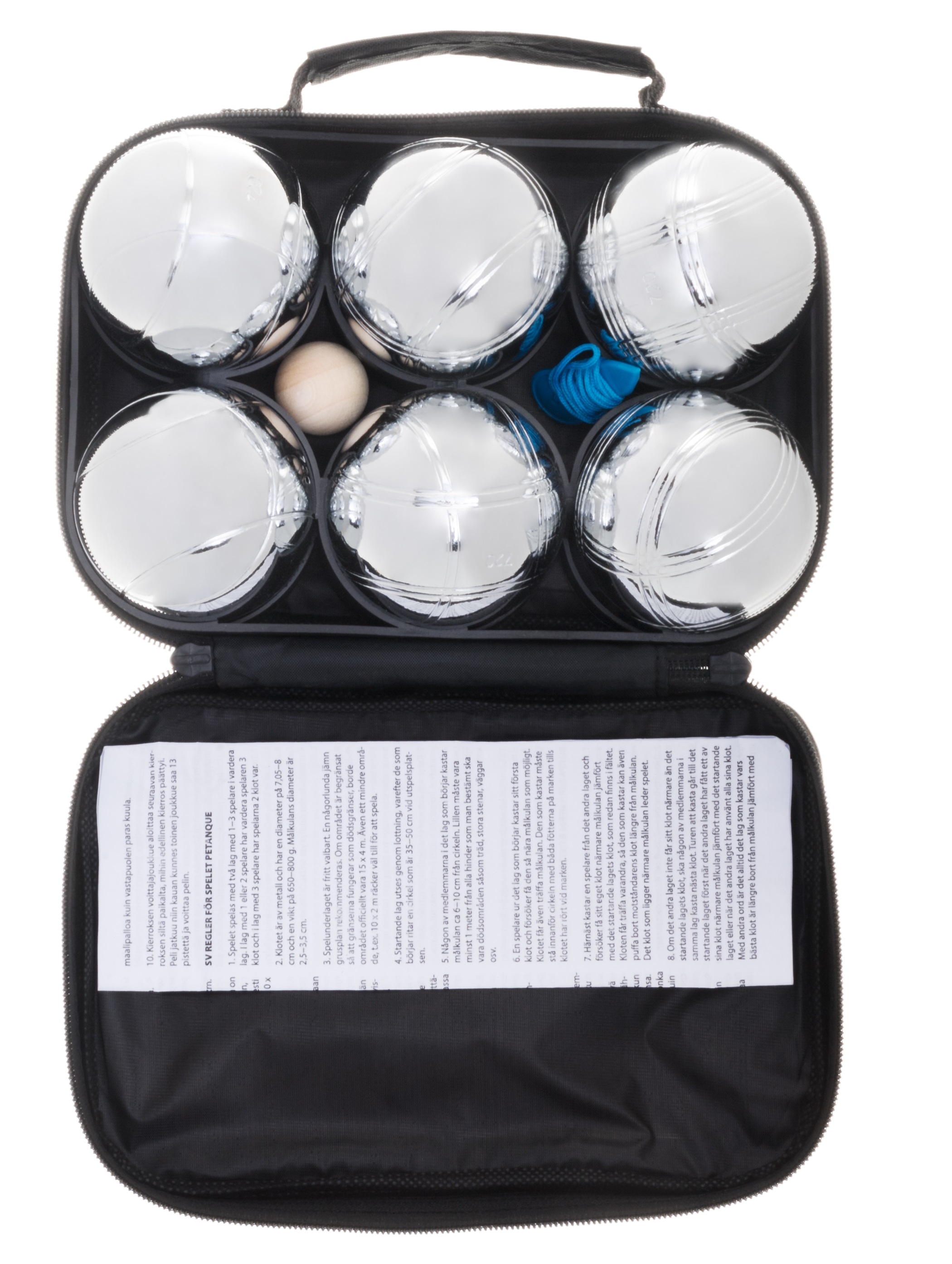 Petanque-peli sisältää 6 metallista palloa (3 paria), pienen puupallon, mittanauhan, kantokassin ja peliohjeen.