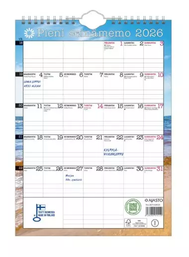 Koko 210 x 290 mm; parikierresidottu; kuukausittain vaihtuva tausta; nimi- ja juhlapäivät; Avainlippu-tuote; FSC®-sertifioitu tuote; 100 % hiilineutraali tuote.