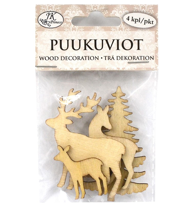 Puiset koristekuviot askarteluun ja koristeluun. Pakkauksessa 3 peuraa ja 1 kuusi.