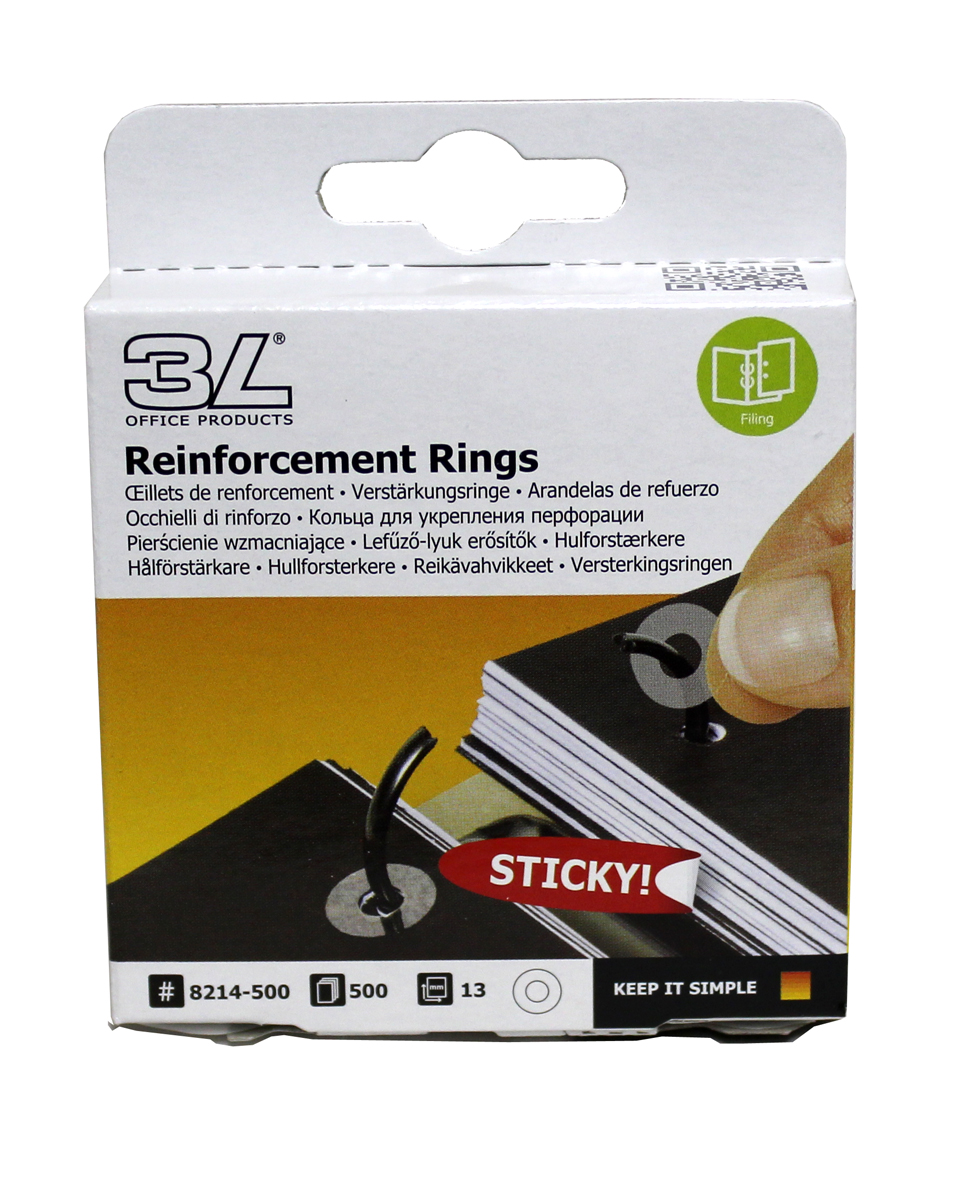 3L Reiänvahvistaja Kirkas muovi, vahvistaa mapin tärkeiden lomakkeiden reiän. Pysyvä liimapinta. Reiän halkaisija: 6 mm. 500 kpl/ras.
