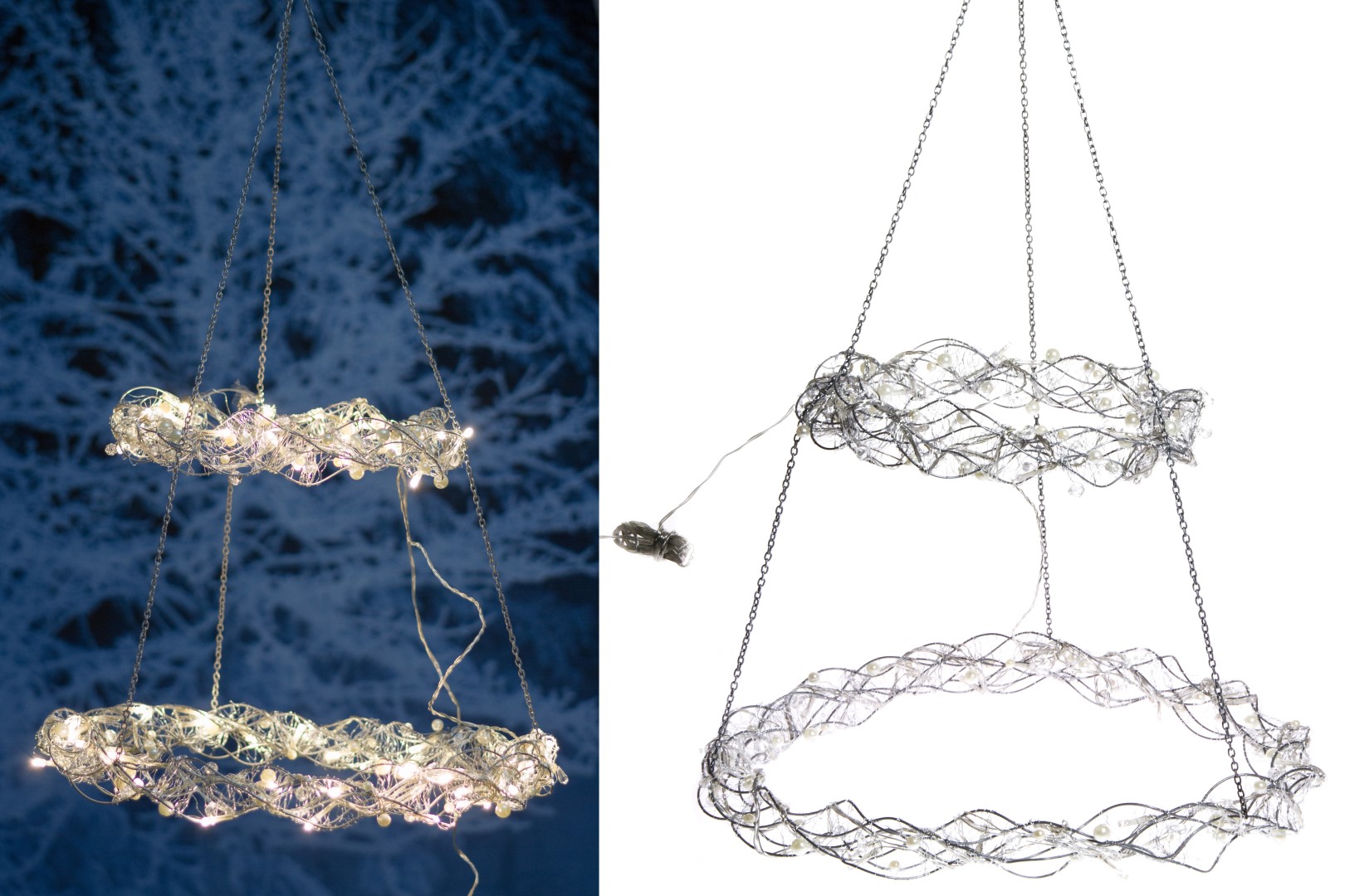 Roikkuva helmivalokranssi FINNLUMOR 60x led lämmin valkoinen 3V, 0,06W. Muuntaja 24V, 100mA, 2,4W, IP20. Roikkuva valokranssi, 2 kerroksinen. Helmi ja akryyli koristet kierretyssä teräslangassa.... Lue lisää