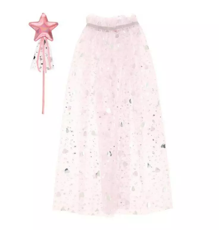 Setissä vaaleanpunainen viitta kultaisella tähti- ja puolikuukoristelulla ja taikasauva tähtikoristeella. Sopii synttäreille ja naamiaisiin sekä prinsessaleikkeihin ihan muuten vain!