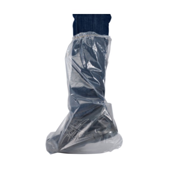 Kertakäyttöiset, kuminauhalla varustetut, muoviset saappaansuojukset, joissa liukastumista estävä teippi.