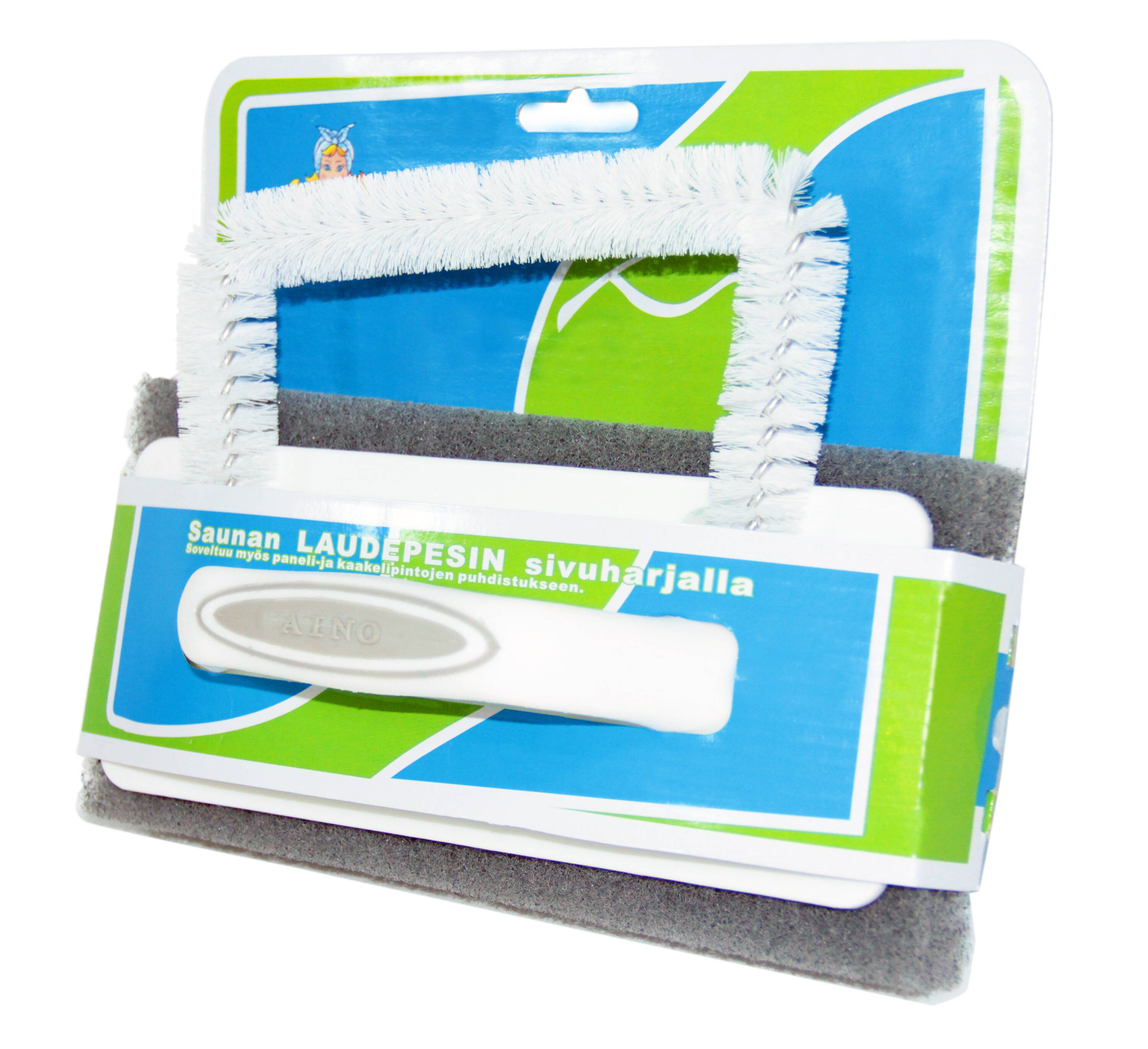 - Tämän siivousvälineen avulla puhdistuu saunan lauteet ja paneelit, sekä suihkutilan tai WC:n kaakelit saumoja myöten.