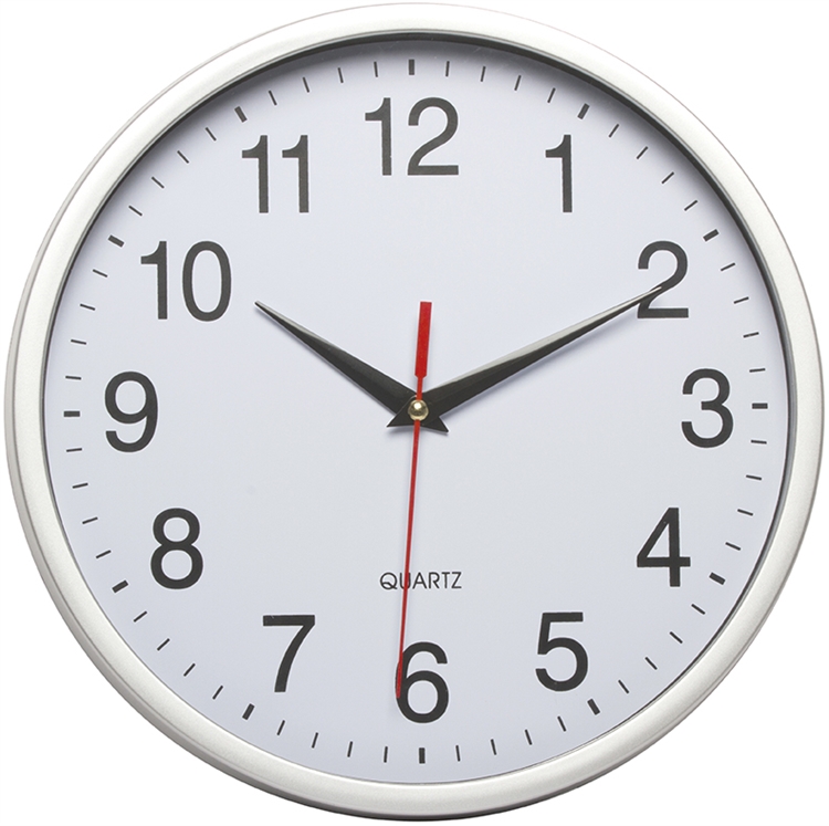 Selkeä ja simppeli seinäkello hopeanvärisillä kehyksillä.