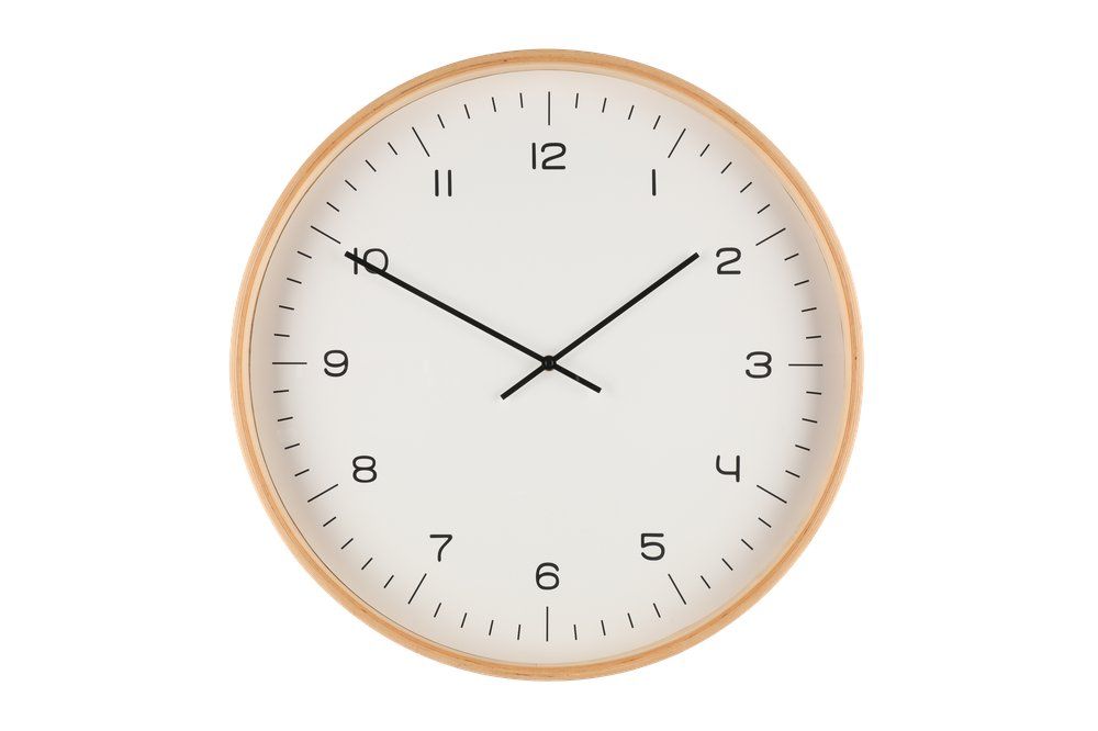 Tyylikäs ja selkeä seinäkello kapeahkolla vanerireunuksella.