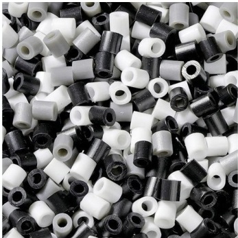 Mustavalkoinen lajitelma silityshelmiä. Hakusanat: hamahelmi, hamahelmet, silityshelmi