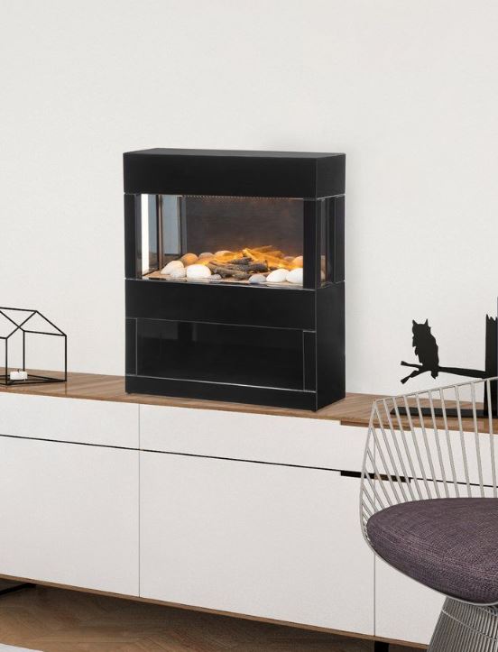 Sähkökäyttöinen vapaastiseisova sisustustakka, jossa kaksi lämmitystehoa. Mukana kaukosäädin. Valkoinen korkeakiiltoviimeistelty MDF-pinta. Alaosassa avosäilytyslokero. LED-valot ja patentoitu aidon näköinen 3D-liekkiefekti, joka näkyy kolmelta sivulta. Takassa lisäksi taustavalot. Voidaan käyttää myös sisutuksellisena takkana liekkiefektin kanssa ilman lämmitystoimintoa. Korkealaatuinen hiljainen tuuletin. Ylikuumenemissuoja. ERP-standardin mukainen. 1,5 m virtajohto. 2000W, 220-240V, 50/60 Hz.