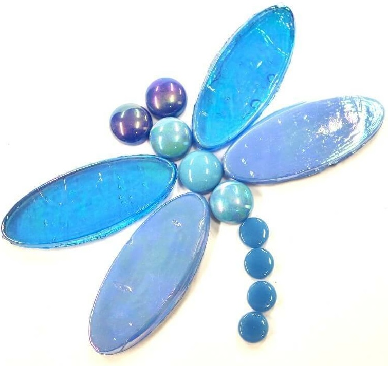 - Pakkauksessa lasimosaiikit ja liima yhteen sudenkorentoon.