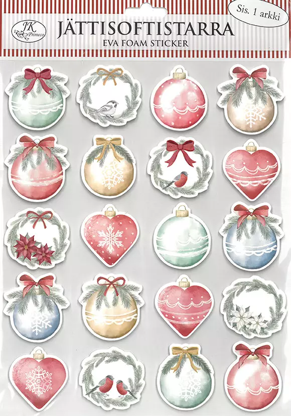 - Pakkaus sisältää yhden arkin erilaisia vaahtomuovisia softistarroja. Tarroissa on glitteriä.