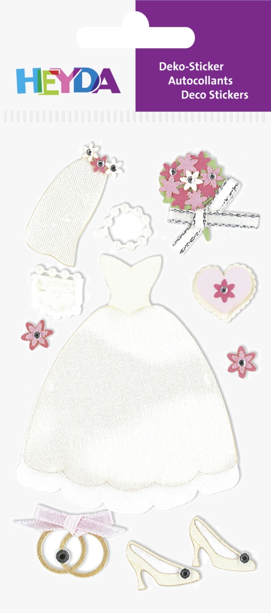 HEYDA Tarra-arkki Häämekko. Pahvipohjaiset tarrat sisältävät yksityiskohtaisia koristeita kuten helmiä, nauhoja ja akryylitimantteja.