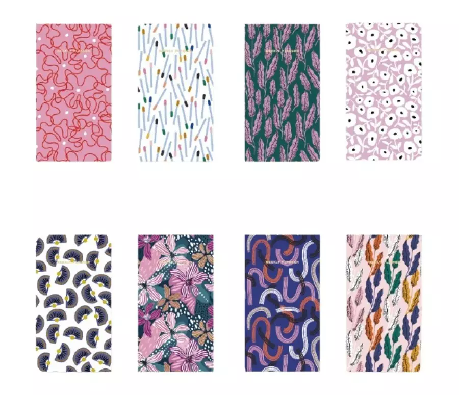 Pienikokoinen taskukalenteri kulkee näppärästi mukana. Useita eri kuosivaihtoehtoja.
