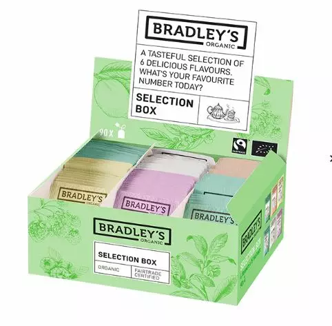 Bradley's on vastuullinen ja korkealaatuinen luomutee. Lajitelmassa kuusi suosittua teemakua, 15 teepussia per maku. Myyntipakkaus toimii myös tarjoiluastiana.