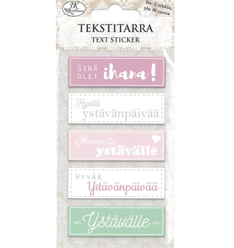 Tekstitarra ystävänpäivän korttiaskarteluun ja koristeluun. Tekstitarroissa neljä erilaista ystävänpäiväteemaista tekstiä.