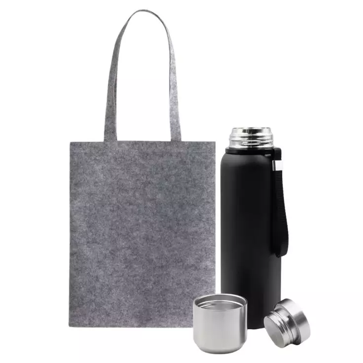 Teräksinen termospullo tyylikkääseen huopakassiin pakattuna.