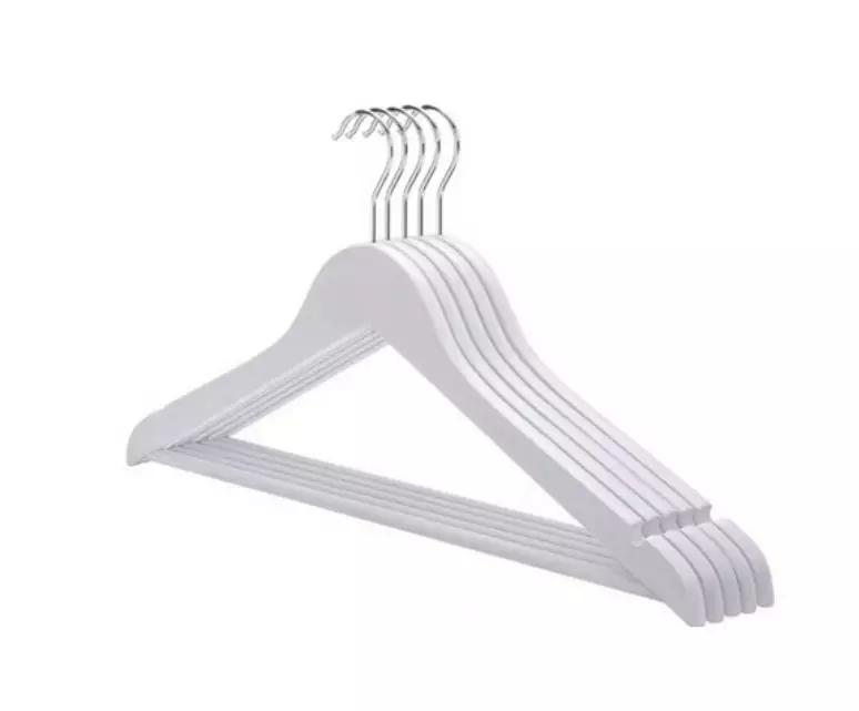 Valkoiseksi maalattu puinen henkari välipuulla.