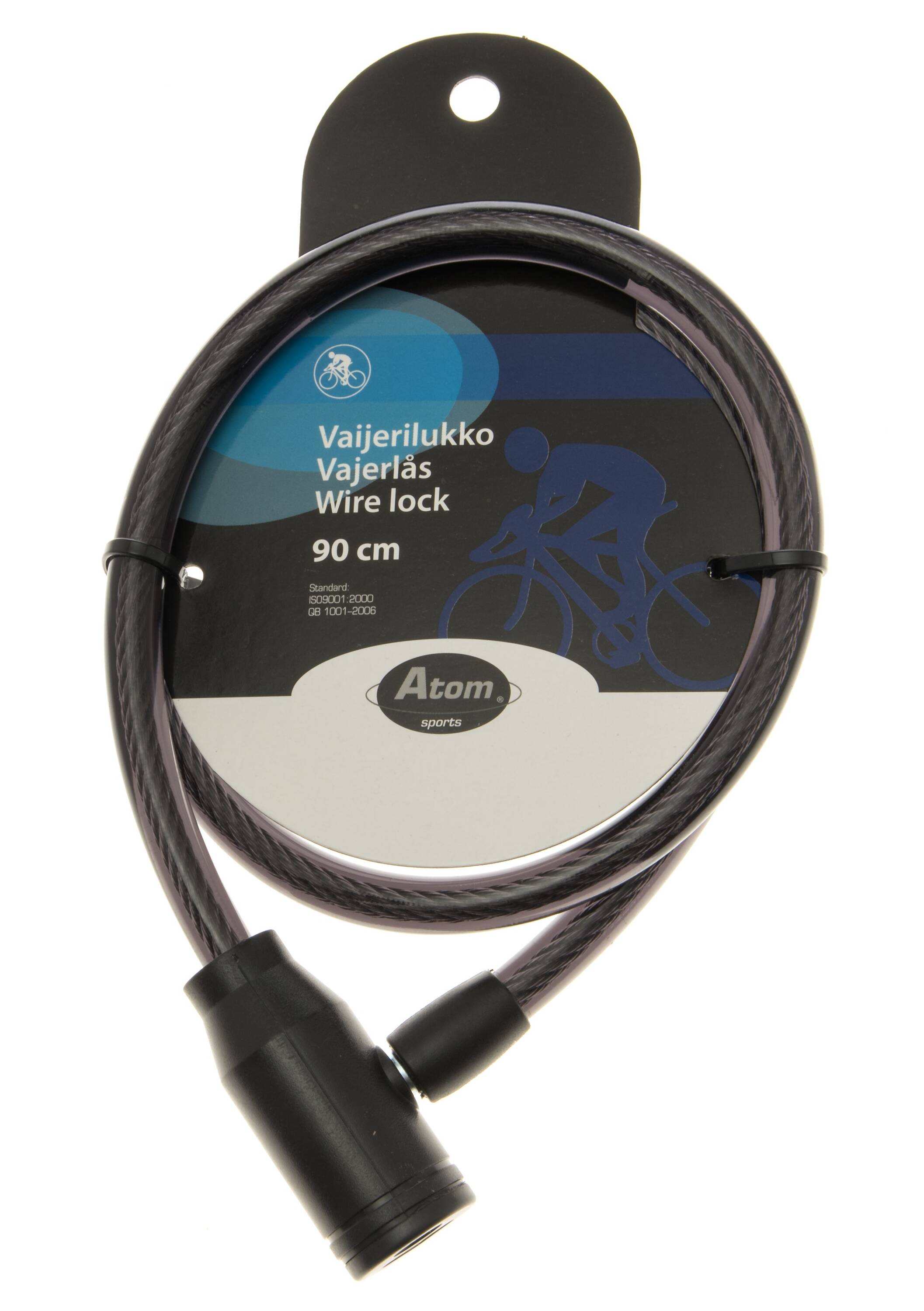 ATOM Vaijerilukko 90 cm pitkä. Halkaisija 12 mm. Kaksi avainta. Materiaalit: ABS, kupari, sinkki metalliseos, PVC ja teräs.
