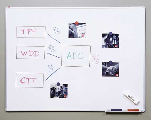 Laadukas kirjoitustaulu magneetti- ja tussipinnalla. Kynäkouru. Kiinnitys seinään. Hakusanat: tussitaulu, ilmoitustaulu