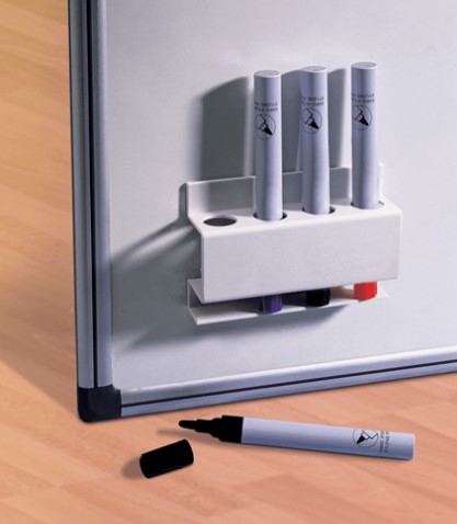 Valkotaulun kynänpidike pitää kynät tallessa ja järjestyksessä. Säilytysasento, jossa korkki on alapäin, hidastaa kynien kuivumista.