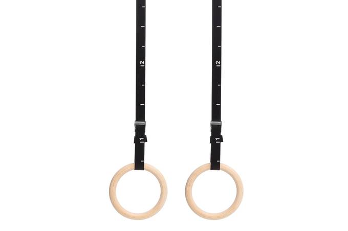 Renkaan halkaisija 23,5 cm. Remmin pituus 495cm. Mustat nauhat, puiset renkaat. Puu, nylon.