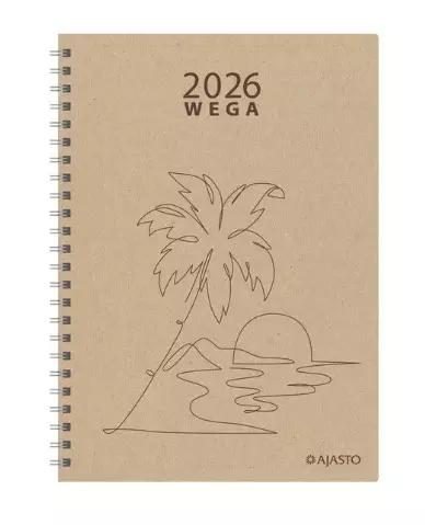 Koko 148 x 210 mm (A5); parikierresidottu; kierrätyskartonkikannet; kielisyys: suomi, ruotsi, englanti; 2026 yleiskalendaario; päiväkirja 52/2025–53/2026; vuosisuunnitelmat 2026 ja 2027; kansalliset vapaapäivät; suomalaiset ja suomenruotsalaiset nimipäivät; liputuspäivät Suomessa; auringon nousu- ja laskuajat (Helsinki, Oulu); kansainvälinen aika; runsaasti muistiinpanotilaa; painettu Suomessa.