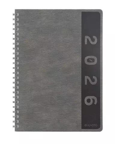 Koko 148 x 210 mm (A5); parikierresidottu; leatherette-kannet; aukeamalla yksinkertainen ja selkeä viikkonäkymä; päiväkirja 1/2026 - 1/2027; muistiinpano- ja kuukausisuunnitelma-aukeamat ennen kuukautta; vuosisuunnitelmat 2026 - 2027; liputuspäivät Suomessa; suomalaiset nimipäivät; muovitasku; FSC®-sertifioitu tuote.