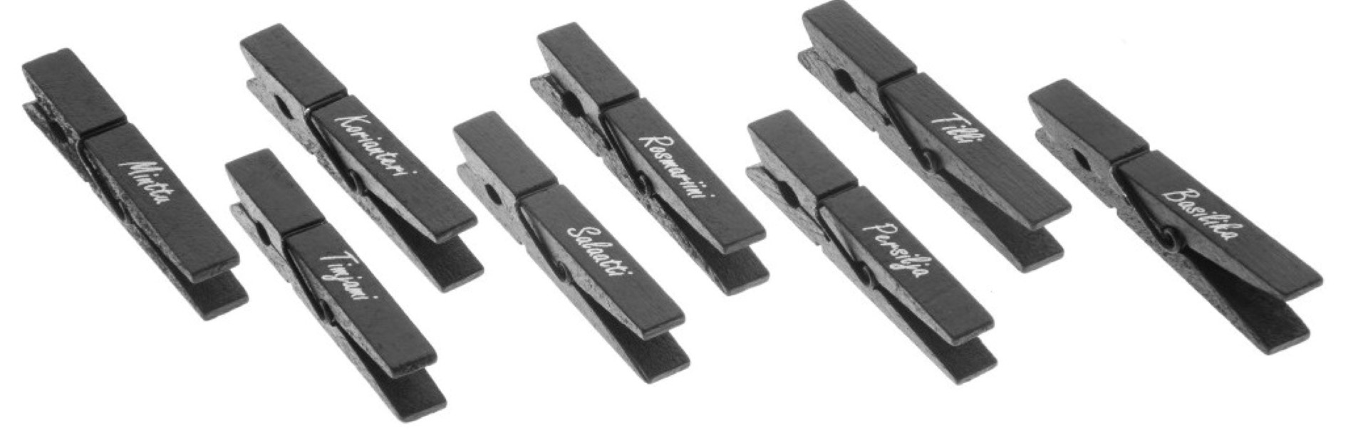 Musta klipsi valkoisella tekstillä:persilja, tilli, basilika, minttu, timjami, korianteri, rosmariini, salaatti